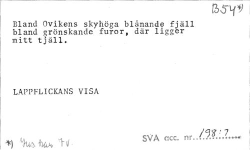 //// Bland Ovikens skyhöga blånande fjäll bland grönskande furor, där ligger mitt tjäll. //// LAPPFLICKANS VISA //// j //// SVA occ mJMiZ~ ////