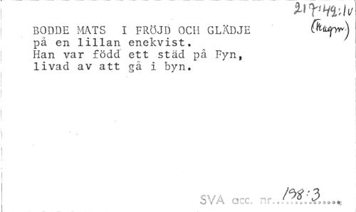 //// BODDE MATS I FRÖJD OCH GLÄDJE (hfyr) //// på en lillan enekvist. //// Han var född ett städ på Fyn, //// livad av att gä i byn. //// S A QCC, * , $ * j^aao»; ////