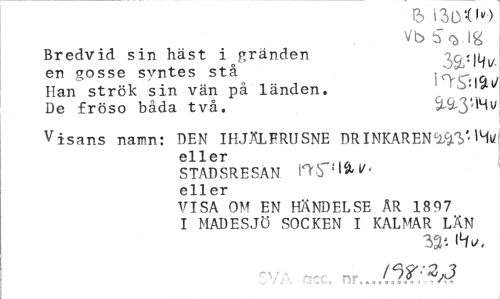 //// VbSVlg //// Bredvid sin häst i gränden //// en gosse syntes stå ;:> - c» //// Han strök sin vän på länden. Vl^i/ //// De fröso båda två. //// Visans namn: DEN IHJÄL FRU SNE DRINKAREN W' »Wtfj eller //// STADSRESAN Wf^V' eller //// VISA OM EN HÄNDELSE ÄR 1897 I MADESJÖ SOCKEN I KALMAR LÄN //// - nr nr-w ////
