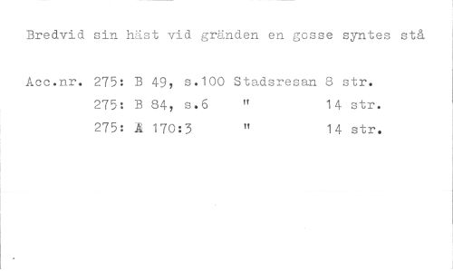 //// Bredvid sin häst vid gränden en gosse syntes stå //// Acc.nr. 275: B 49, s.100 Stadsresan 8 str. //// 275: B 84, s.6 " 14 str. //// 275: Å 170:3 " 14 str. ////