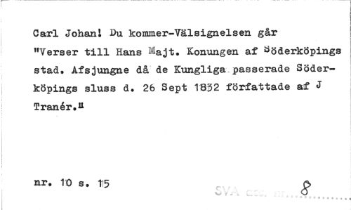 //// Carl Johanl Du kommer-Välsignelsen går "Yerser till Hans Majt. Konungen af Söderköpings stad, Afsjungne då de Kungliga passerade Söderköpings sluss d. 26 Sept 1832 författade af J Tranér.a //// nr. 10 s. t5 g ////