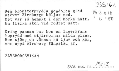 //// m-u //// Den blomsterprydda gondolen gled ]/«„ . utöver Älvsborgs böljor ned. - c- //// Det var så hemskt i den mörka natt. ' k " SD En flicka skön vid rodret satt. //// Kring pannan bar hon en lagerkrans beprydd med stjärnornas milda glans. Hon sjöng om vännen så liuv och kär, som uppå Älvsborg fängslad är. //// ÄLVSBORGSVISAN //// SVA ccc. nr../??:'.?... ////