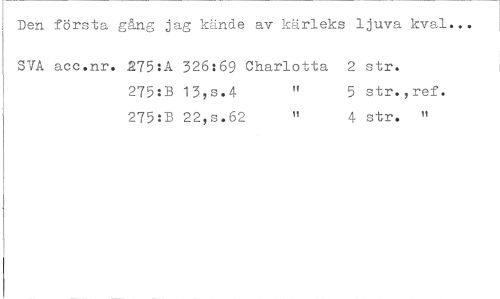 //// Den första gång jag kände av kärleks ljuva kval... //// SVA acc.nr. 275:A 326:69 Charlotta 2 str. //// 275:B 13,s.4 " 5 str.,ref. //// 275:B 22,s.62 " 4 str. " ////