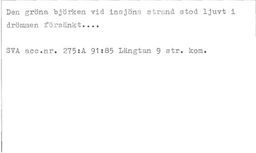 //// Den gröna björken vid insjöns strand stod ljuvt i drömmen försänkt... //// SVA acc.nr. 275:A 91:85 Längtan 9 str. kom. ////