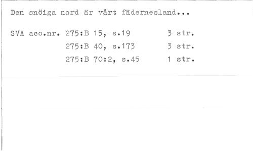 //// Den snöiga nord är vårt fädernesland... //// SVA acc.nr. 275:B 15, s.19 3 str. //// 275sB 40, s.173 3 str. //// 275:B 70:2, s.45 1 str. ////