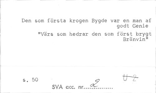//// Den som första krogen Bygde var en man af //// godt Genie //// "Värs som hedrar den som först brygt //// Bränvin" //// s. 50 ^ //// SVA ccc. nr,... ////