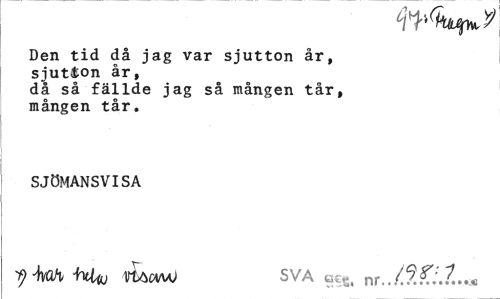 //// Den tid då jag var sjutton år, sjutton år, //// då så fällde jag så mången tår, mången tår. //// SJÖMANSVISA tj^Qh Mhj VtöcvW SVA tj£S, nr.. ////