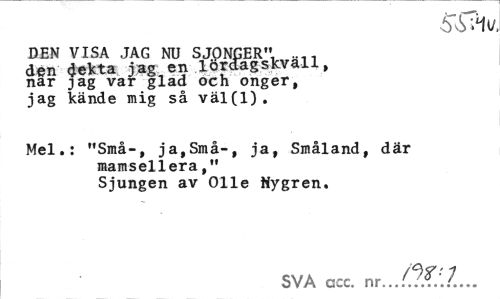//// SSTHl/ //// DEN VISA JAG NU SJONGER" den cjekta jag en lördagskvali, nar jag var glad och onger, jag kände mig så väl(l). //// Mel.: "Små-, ja,Små-, ja, Småland, där mamsell era //// Sjungen av Olle Hygren. //// SVA cscc. nr../.?.?/7... ////