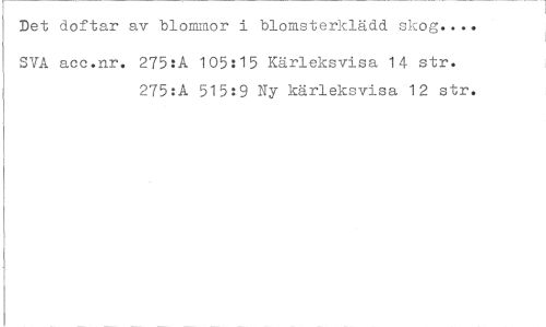 //// Det doftar av blommor i blomsterklädd skog... //// SVA acc.nr. 275sA 105:15 Kärleksvisa 14 str. //// 275:A 515:9 Ny kärleksvisa 12 str. ////