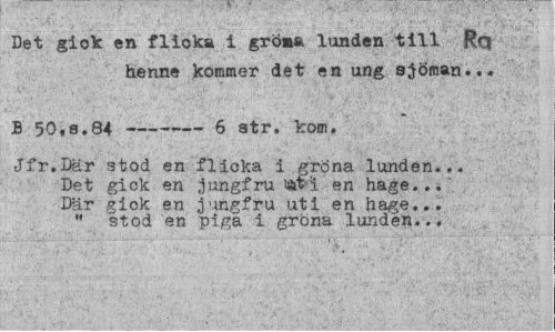 //// Det giok en flicka i grö*a lunden till Rq henne kommer det en ung sjöman... //// B 50fs.84---6 atr. kom. //// Jfr.Där stod en flicka i gröna lunden... Det gick en jungfru i&t-l en hage... Där gick en jungfru uti en hage... " stod en piga i gröna lunden... ////