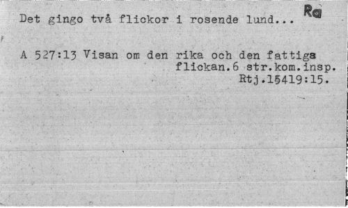 //// Ka //// Det gingo två flickor i rosende lund... //// A 527:13 Visan om den rika och den fattiga //// flickan.6 str.kom.insp. //// Rtj.1§419:15. ////
