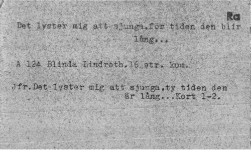 //// Ro //// Det lyster mig att - a^ng^far tiden den blir //// J. 'lång.. ? //// A -124 Blinda -Lindroth, 16 str. kom, //// Jfr.Det lyster mig att sjunga,ty tiden den //// är lång.-.Kort 1-2. ////