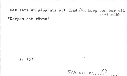//// Det satt en gång uti ett träd /'En korp som bar uti //// sitt näbb //// "Korpen och räven" s. 157 //// SVA cscc. nr... ////