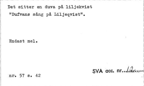//// Det sitter en duva på liljekvist "Dufvans sång på Liljeqvist". //// Endast mel. //// SVA acc. nr.../Av.j>» //// nr. 57 s. 42 ////