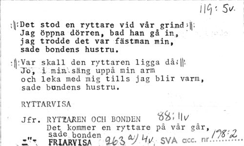 //// Ilt}'- 5V //// ;|t Det stod en ryttare vid vår grind »jj: Jag öppna dörren, bad han gå in, jag trodde det var fästman min, sade bondens hustru. //// :J|:Var skall den ryttaren ligga då.'||' Jo', i min.säng uppå min arm och leka med mig tills jag blir varm, sade bandens hustru. //// RYTTARVISA //// Jfr. RYTTAREN OCH BONDEN 'II/ //// Det kommer en ryttare på vår går, n sade bonden „ AjJ U , a . .t/0'au fri ärvt ra äis S» ^ SVAccc. nr... ////