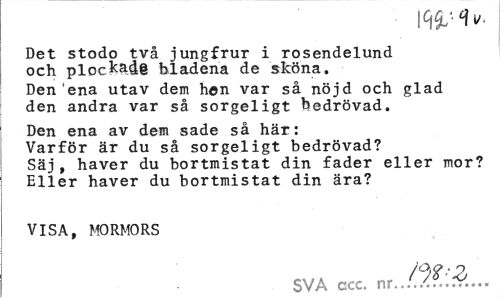 //// Wfv. //// Det stodo två jungfrur i rosendelund och plockade bladena de sköna. Den 'ena utav dem hon var så nöjd och glad den andra var så sorgeligt bedrövad. //// Den ena av dem sade så här: //// Varför är du så sorgeligt bedrövad? //// Säj, haver du bortmistat din fader eller mor? //// Eller haver du bortmistat din ära? //// VISA, MORMORS //// SVA ccc. ////