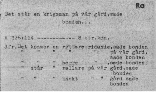 //// Ro //// Det står en krigsman på vår gård,sade //// bonden. //// A 326:114---«*—— 8 str.kom. //// Jfr.Det kommer en ryttare ridande,sade bonden •» " " " ' på vår gård, //// sade bonden //// « >< " herre " ,sede bonden " står M rallare på vår gård,sade //// bonden //// « H " knekt " " gård sade //// bonden ////