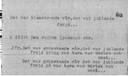 //// i Ra //// | Det var blomstrande vår,det var jublande //// fröjd... //// | A 46^:6 Den störda lyckan.6 str. t- //// = Jfr.Det var grönskande vår,det var jublande 3 fröjd kring var tuva var kärlek och //// 3 smek... //// Det var grönskande vår det' var jublande fröjd på var tuva var kärlek ooh //// smek... ////