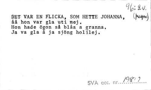 //// DET VAR EN FLICKA, SOM HETTE JOHANNA, (f^vw) åå hon var gla uti mej. Hon hade ögon så blåa a granna. Ja va gla å ja sjöng holilej. //// SVA ecc. ////