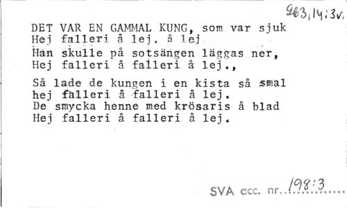 //// DET VAR EN GAMMAL KUNG, som var sjuk Hei falleri å lej. a lej Han skulle på sotsängen läggas ner, Hej fallcri å falleri å lej., //// Så lade de kungen i en kista så smal hej fälleri å falleri å lej. De smycka henne med krösaris å blad Hej falleri å falleri å lej. //// SVA ccc. nr...^... ////