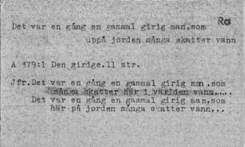 //// ftä //// I)et var en gång en gammal girig man,som //// uppå .jorden många skatter vann //// A V79:l Den girige.ll str. //// Jfr.Det var en gång en gammal girig man,som många skatter ffär l. världen vana..,... //// Det var en gång en gammal girig man,som . här på jorden många skatter vann... ////