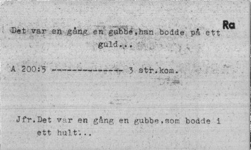 //// Ro //// Det var en gäng en gubbe,han bodde, på ett , guld... //// A 200:5 --- 3 str.kora. //// Jfr.Det var en gång en gubbe,som bodde i ett hult-... ////