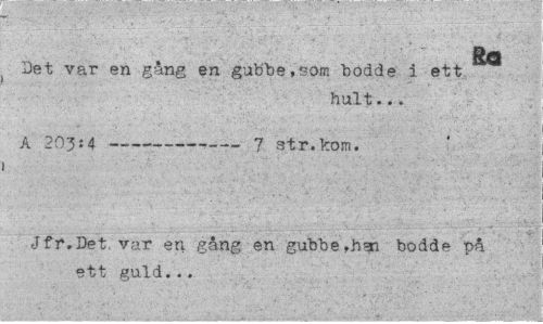 //// Sta //// Det var en gång en gubbe,som bodde i ett //// hult... //// A 203:4 --- 7 str.kom. //// 1 //// Jfr.Det. var en gång en gubbe,hgn bodde på ett guld... ////