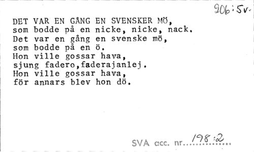 //// m>' sv- //// DET VAR EN GANG EN SVENSKER Mö, som bodde på en nicke, nicke, nack. Det var en gång en svenske mö, som bodde på en ö. Hon ville gossar hava, sjung fadero,faderajanlej. Hon ville gossar hava, för annars blev hon dö. //// SVA ccc. nr... ////
