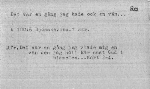 //// Ra //// Det var en gång jag hade ock en vän... A 100:6 ojöraansvisa.7 str. //// Jfr,Det var en gång .jag vlade mig en //// vän den iag höll kär näst-Gud i himmelen...Kort 2-4. ////