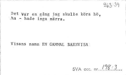 //// Det Var en gång jag skulle köra hö, vha - hade inga märra. //// Visans namn EN GAMMAL BARNVISA //// SVA ccc. nr../??:'.1?... ////