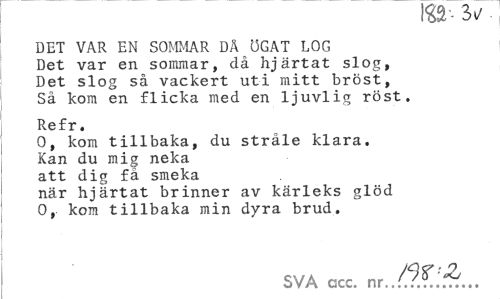 //// r&r- 5\/ //// DET VAR EN SOMMAR DÅ ÖGAT LOG Det var en sommar, då hjärtat slog, Det slog så vackert uti mitt bröst, Så kom en flicka med en ljuvlig röst, //// Refr. //// 0, kom tillbaka, du stråle klara. Kan du mig neka att dig fä smeka //// när hjärtat brinner av kärleks glöd 0, kom tillbaka min dyra brud. //// SVA cscc. ////