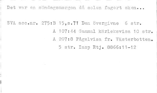 //// Det var en söndagsmorgon då solen fagert sken... //// SVA acc.nr. 275:B 15,s.7T Den övergivne 6 str. //// A 107:44 Gammal kärleksvisa 10 str. A 207:8 Fågelvisa fr. Västerbotten. 5 str. Insp Rtj. 8866:11-12 ////