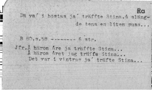 //// J Ra //// Dä va' i höstas ja' träff te Stina, å. släng- //// * de tena en liten puss... //// j _ • • //// B S0,s.58 --- 6 str. //// | Jfr.Å härom are ja träffte Stina... //// Å härom året jag träffa Stina... - Det var i vintras ja' träfte Stina... ////