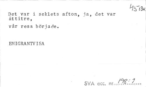 //// HhTi //// Det var i seklets afton, ja, det var åttitre, //// vår resa började. EMIGRANTVISA //// SVA ccc, nr.. ////