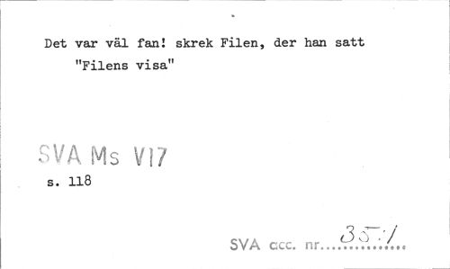 //// Det var väl fan! skrek Filen, der han satt //// "Filens visa" //// SVA Ms VI7 //// s. 118 //// SVA ccc. nr.../t?' V./.. ////