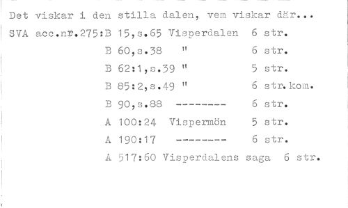 //// Det viskar i den stilla dalen, vem viskar där... //// SVA acc.nr.275:3 15,s.65 Visperdalen 6 str. //// B 60,s.38 » 6 str. //// B 62:1,c.39 " 5 str. //// B 8 5: 2, s. 49 " 6 s t r. ko ra. //// B 90,s.88 --- 6 str. //// A 100:24 Vispermön 5 str. //// A 190:17 --- 6 str. //// A 517:60 Visperdalens saga 6 str. ////