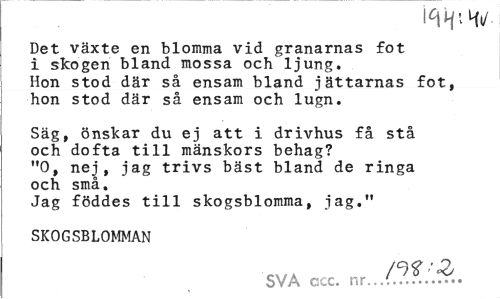 //// Det växte en blomma vid granarnas fot i skogen bland mossa och ljung. Hon stod där så ensam bland jättarnas fot, hon stod där så ensam och lugn. //// Säg, önskar du ej att i drivhus få stå och dofta till mänskors behag? "0, nej, jag trivs bäst bland de ringa och små. //// Jag föddes till skogsblomma, jag." SKOGSBLOMMAN //// SVA occ nr.. ////