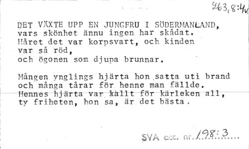 //// det växte upp en jungfru i Södermanland, //// vars skönhet ännu ingen har skådat. Håret det var korpsvart, och kinden var så röd, //// och ögonen som djupa brunnar. //// Mången ynglings hjärta hon .satta uti brand och många tårar för henne man fällde. Hennes hjärta var kkllt för kärleken all, ty friheten, hon sa, är det bästa. //// SVA cec. nr. ////