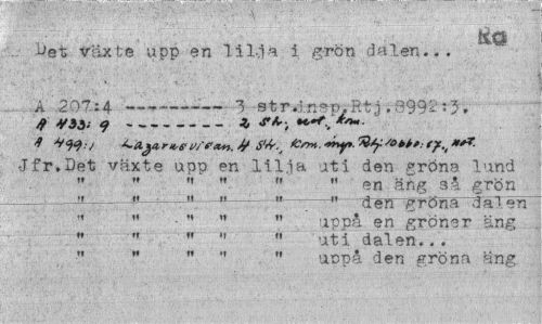 //// tid //// . Det växte upp en lilja i grön dalen... Å .207:4 —---3 s t r.j. n s p. Rt j . 899 i¦ • 5 ? //// Q Vid; ef--- //// 4 ^A^r+et/fe*». J/ S'4., ^'OM», t?., »**¦ //// •Jfr.Det växte upp en lilja uti den gröna lund //// " " " " en äng 3.4 grön //// " " •" " " uppå en gröner äng //// " " " uti dalen... " " " " " uppå den gröna äng ////