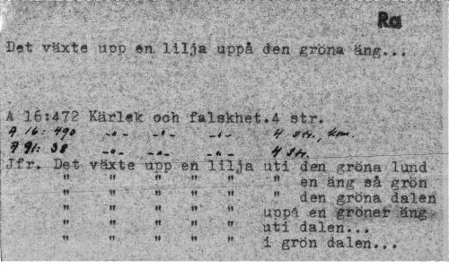 //// Ra //// Det växte udd en. 111,1» uppå den gröna äng... //// A 16:47? Kärlek och falskhet.4 str. //// Jf /t: tf* - -* - * //// 9 f/.- J/ -•„ t /A, - - - ' //// Jfr^^et^äxte-uo^-enUl.Ta uti den gröna-lund //// .i <» « « «. »• en äng så grön //// « « « » » M den gröna dalen //// n * * " " upp^i en gröner äng- //// « .. h ti uti dalen... //// « « »« " " i grön dalen... ////