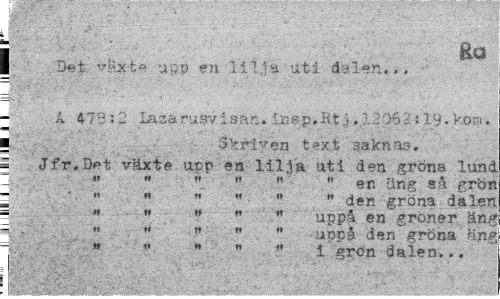 //// i Ra //// | Det ^.Mxte upp en lilla uti ds len... //// j^y- \ " * .¦ ' " //// A 47uu. lasarusvisaft. inep.Rt . ?..106 ti 19. korn. ¦ Skriven t*xt saknas. //// S Jfr.Det växte upp en lilja uti den gröna lunc //// 1 « « " " " " en äng så gror //// 2 " " " ...den gröna däler //// ? " M . " " " uppa en gröner än.* //// 5 " " " '. " . " upps den gröna am //// n " " " i grön daien... ////