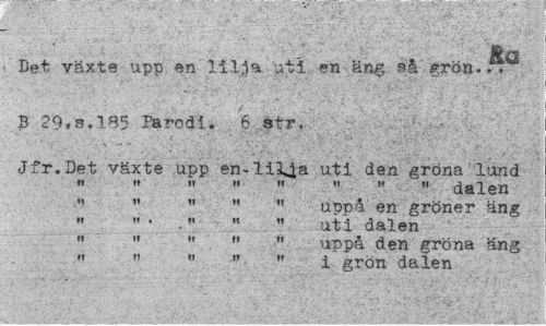 //// Det växte upp en lilja uti en äng så grön... B 29,3.185 Parodi. 6 str, //// Jfr.Det växte upp en-lilja uti den gröna lund »i m » m « " " " dalen //// *» " " * " uppå en gröner äng //// « " • ." " " uti dalen //// « " " " " uppå den gröna äng //// " " " " " i grön dalen ////