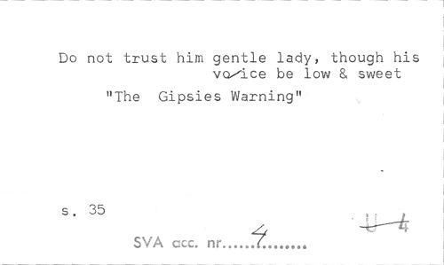 //// Do not trust him gentle lady, though his //// vo/ice be low & sweet //// "The Gipsies Warning" //// -...i //// SVA ccc. nr...7... ////