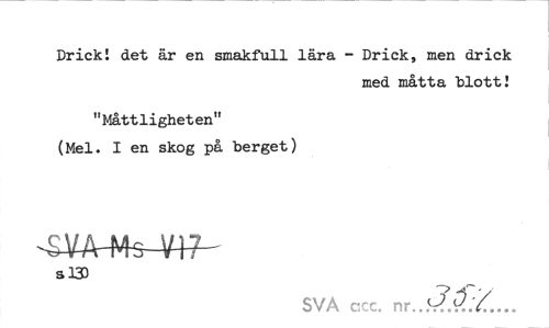 //// DrickI det är en smakfull lära - Drick, men drick //// med måtta "blott I //// "Måttligheten" (Mel. I en skog på berget) //// m-Ms-w- //// s 133 //// SVA ccc. nr. ////