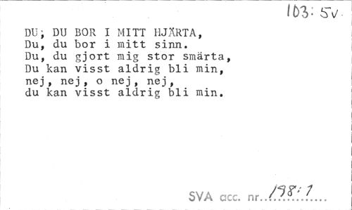 //// 107) . SV //// DU; DU BOR I MITT HJÄRTA, Du, du bor i mitt sinn. Du, du gjort mig stor smärta, Du kan visst aldrig bli min, nej , nej , o nej , nej , du kan visst aldrig bli min. //// SVA ccc. nr../M:l... ////