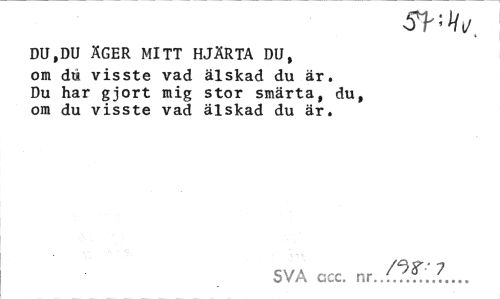 //// SHJ/l/. //// DU,DU ÄGER MITT HJÄRTA DU, om du visste vad älskad du är. Du har gjort mig stor smärta, du, om du visste vad älskad du är. //// SVA ccc. nr./?.?.'.?... ////