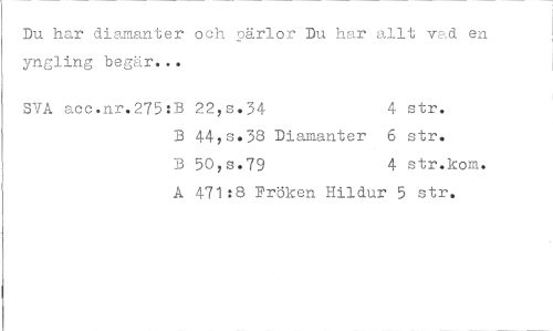 //// Du har diamanter och pärlor Du har allt v.d en yng3ing begär... //// SVA acc.nr.275 iB 22,s.34 4 str. //// B 44,s.33 Diamanter 6 str. B 50,s.79 4 str.kom. //// A 471:8 Fröken Hildur 5 str. ////