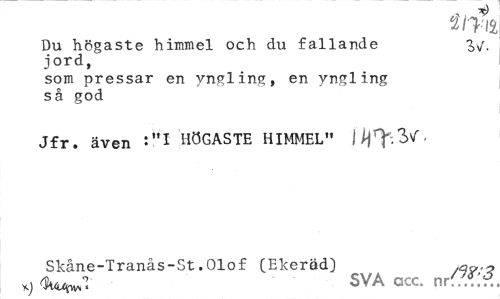 //// Du högaste himmel och du fallande isf. //// jord, //// som pressar en yngling, en yngling så god //// Jfr. även HÖGASTE HIMMEL" ilj^:^- //// Skåne-Tranås-St.Olof CEkeröd) x) SVA occ. nr(?°y. ////