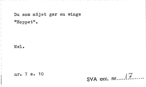 //// Du som nöjet ger en winge "Hoppet". //// Mel. //// nr. 7 s. 10 < <7 //// SVA acc. nr...'..T... ////