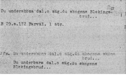 //// Du undersköna dal,o säg.du skogens Blekings- //// brud... //// B 29.s.172 Farväl. 1 str. //// Jfr, Du undersköna dal,o säg-,du 'skogans; sköna. //// ¦ , . brud.,. //// Du underbara dal,o säg.du skogens Blekingsbrud... ////
